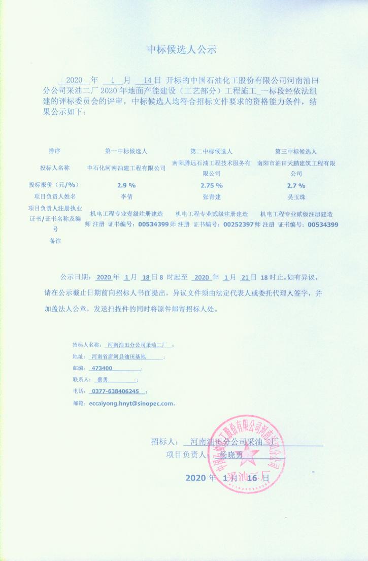 2020 年 1 月 14日 开标的中国石油化工股份有限公司河南油田分公司采油二厂2020年地面产能建设(工艺部分)工程施工_一标段经依法组建的评标委员会的评审,中标候选人均符合招标文件要求的资格能力条件,结果公示如下: