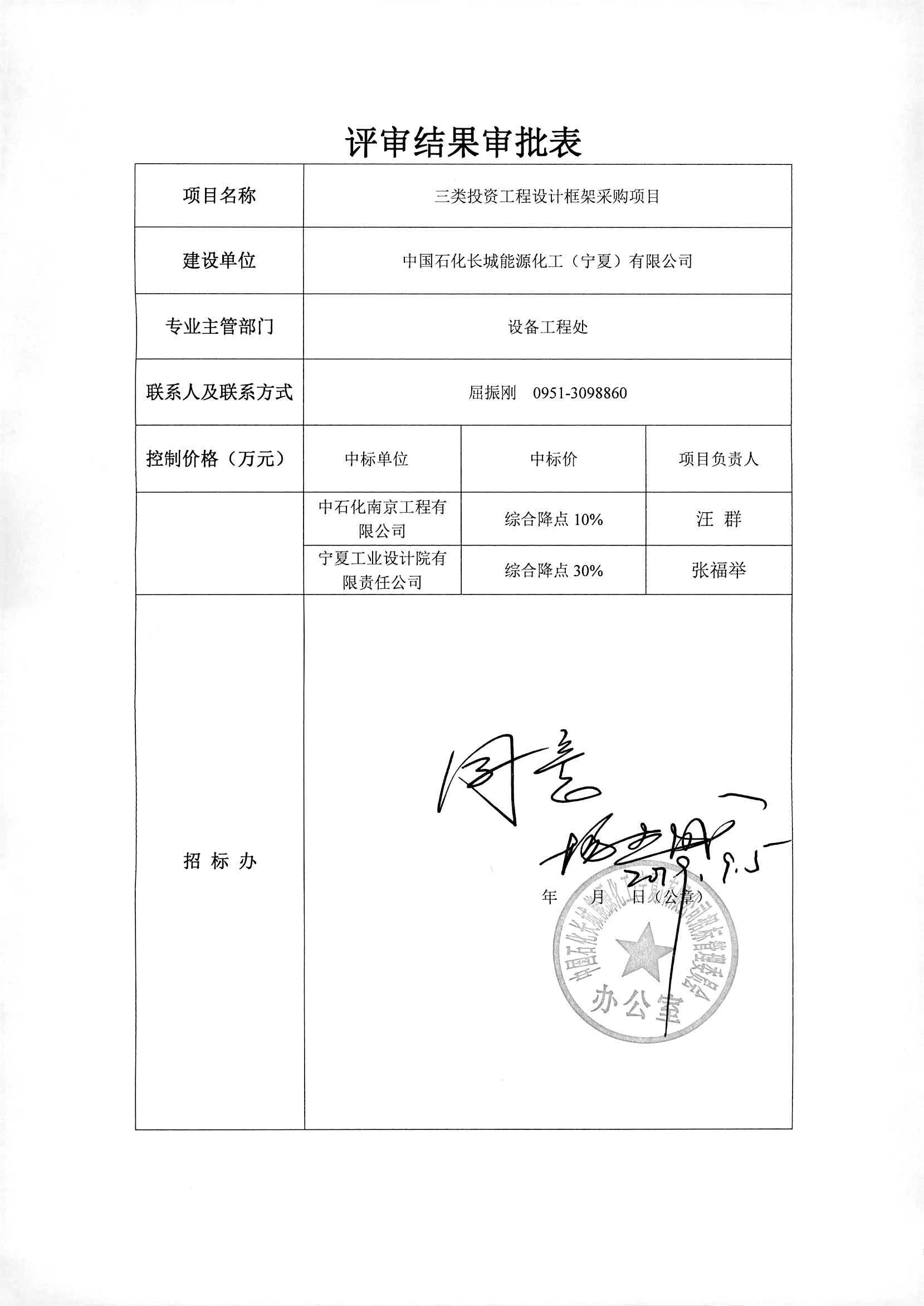 2019 年 9 月 5 日 开标的中国石化长城能源化工(宁夏)有限公司三类投资工程设计_一标段经依法组建的评标委员会的评审,中标候选人均符合招标文件要求的资格能力条件,结果公示如下: