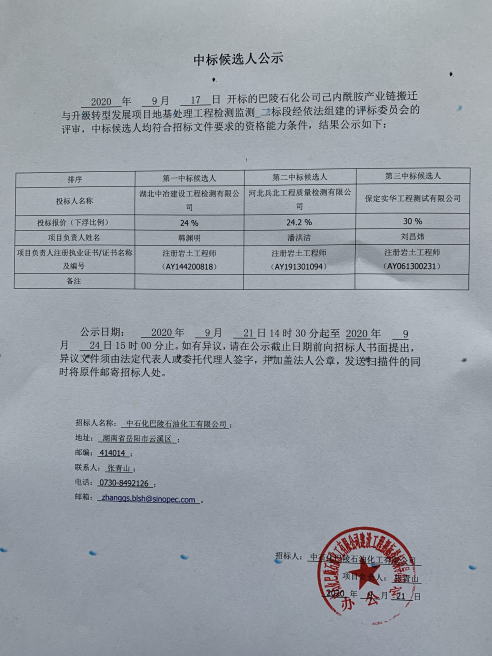 2020 年 9月 17 日开标的巴陵石化公司己内酰胺产业链搬迁与升级转型发展项目地基处理工程检测监测_一标段经依法组建的评标委员会的评审,中标候选人均符合招标文件要求的资格能力条件,结果公示如下: