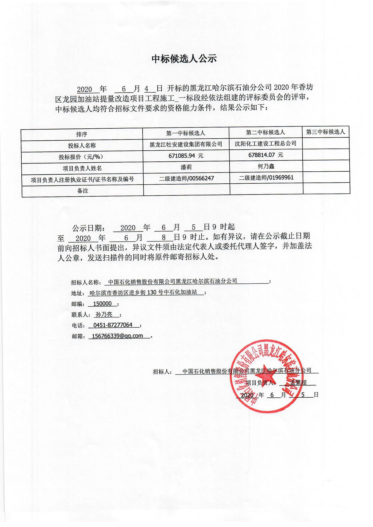 2020 年 6 月 4 日 开标的黑龙江哈尔滨石油分公司2020年香坊区龙园加油站提量改造项目工程施工_一标段经依法组建的评标委员会的评审,中标候选人均符合招标文件要求的资格能力条件,结果公示如下: