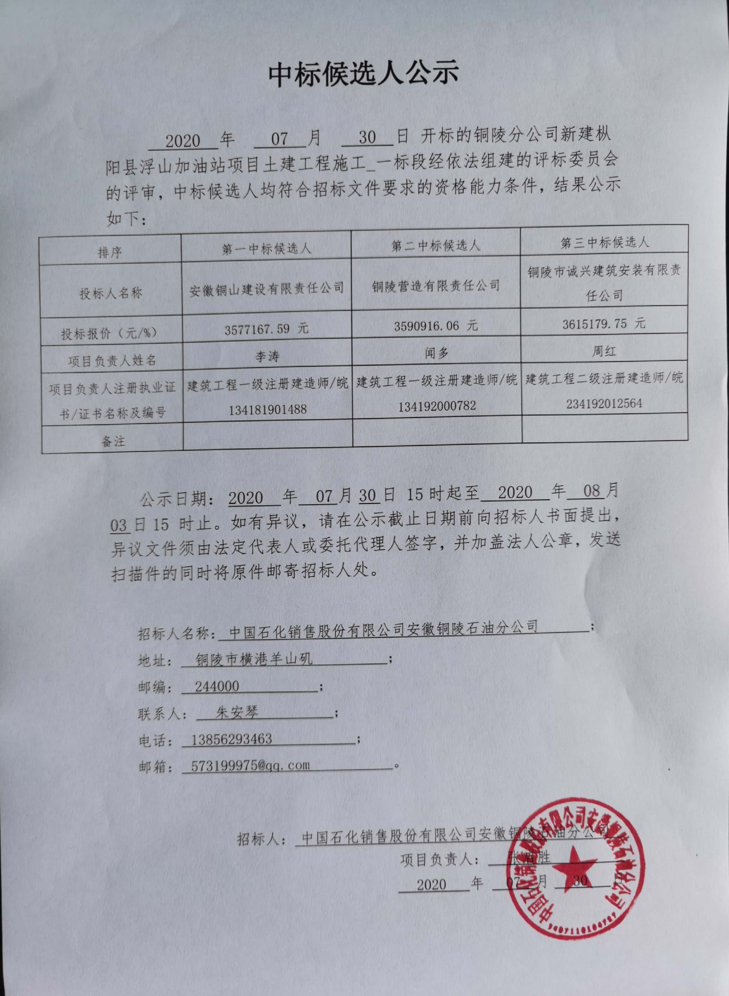 2020 年 07 月 30 日 开标的铜陵分公司新建枞阳县浮山加油站项目土建工程施工_一标段经依法组建的评标委员会的评审,中标候选人均符合招标文件要求的资格能力条件,结果公示如下: