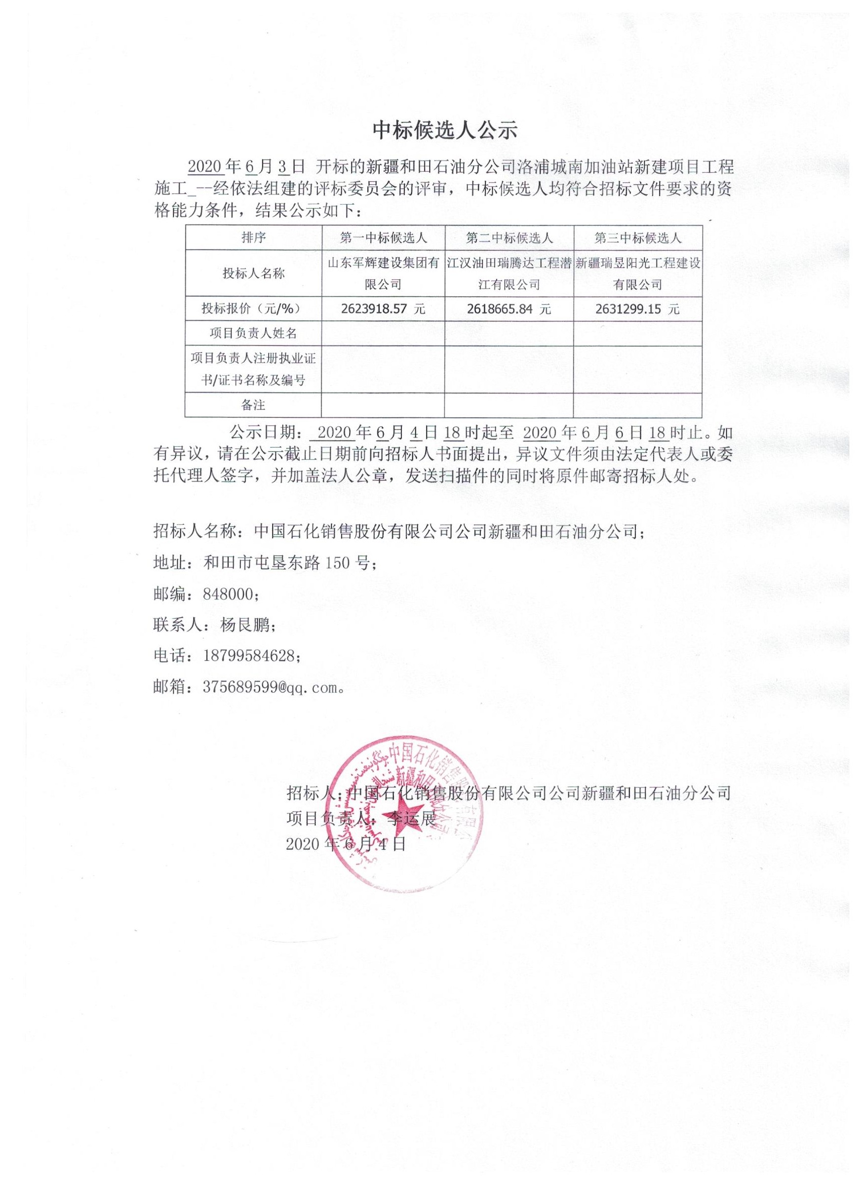 2020 年 6 月 3 日 开标的新疆和田石油分公司洛浦城南加油站新建项目工程施工_--经依法组建的评标委员会的评审,中标候选人均符合招标文件要求的资格能力条件,结果公示如下: