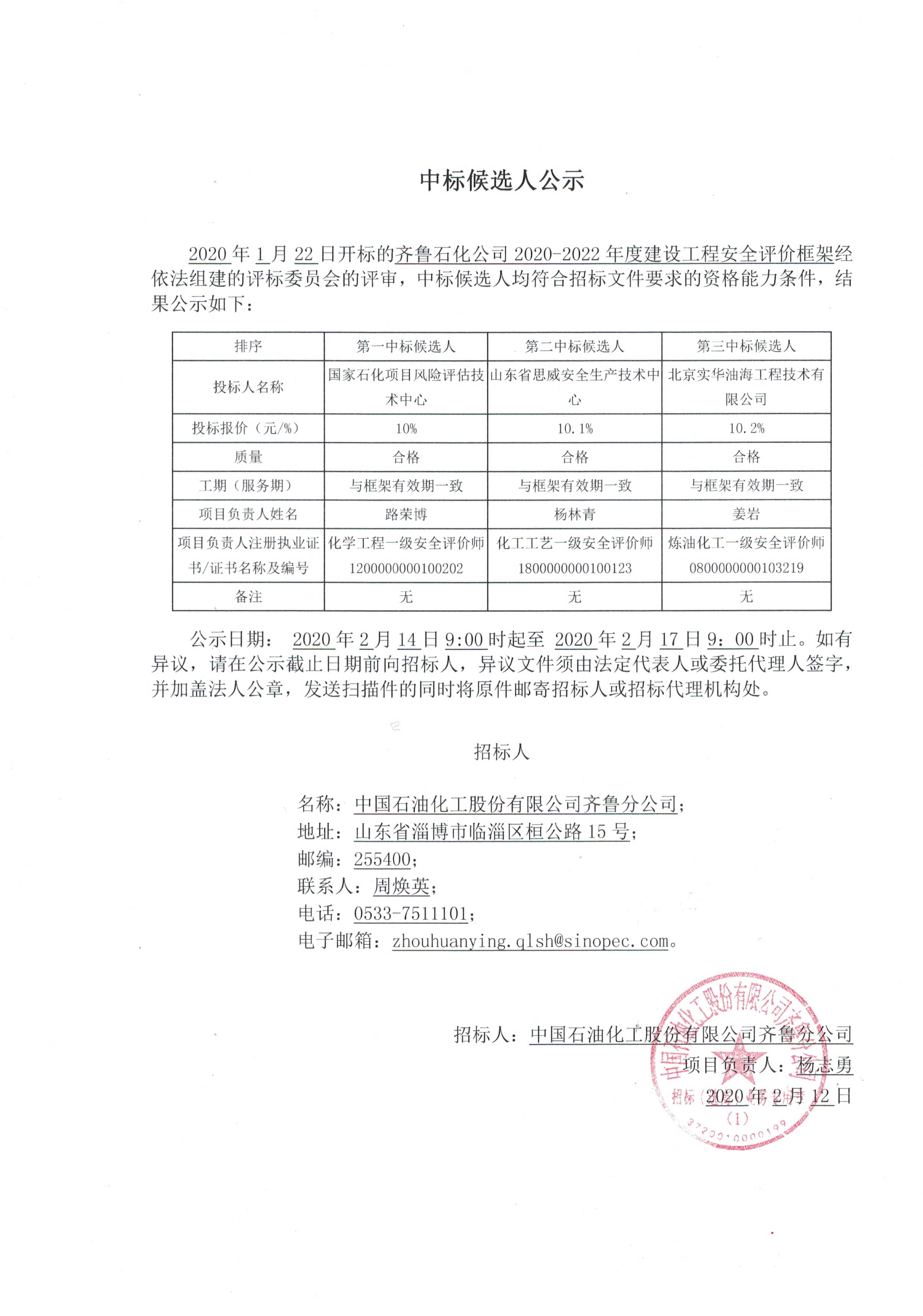 2020年1月22日开标的齐鲁石化公司2020-2022年建设工程安全评价框架经依法组建的评标委员会的评审,中标候选人均符合招标文件要求的资格能力条件,结果公示如下: