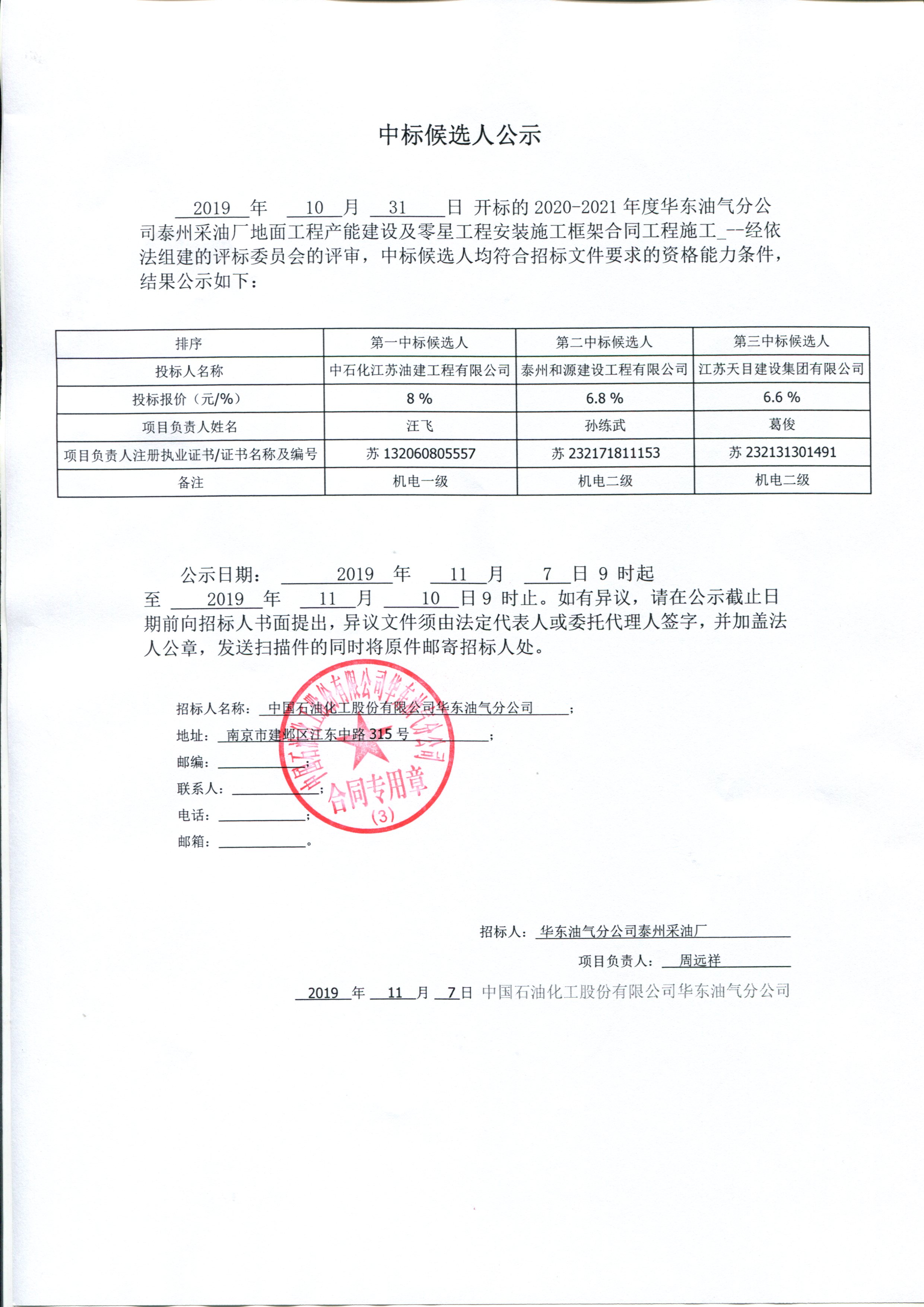 2019 年 10 月 31 日 开标的2020-2021年度华东油气分公司泰州采油厂地面工程产能建设及零星工程安装施工框架合同工程施工_--经依法组建的评标委员会的评审,中标候选人均符合招标文件要求的资格能力条件,结果公示如下: