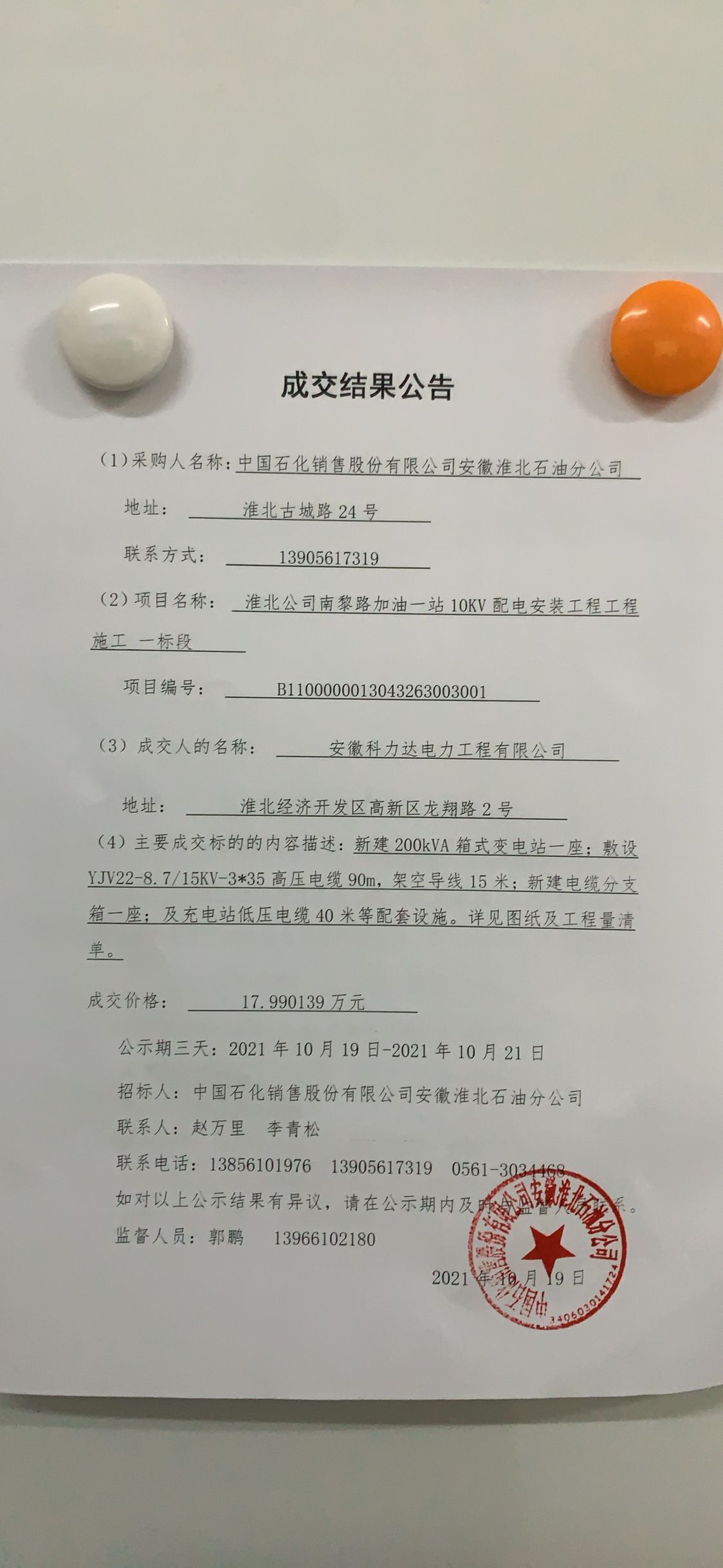 (2)项目名称: 淮北公司南黎路加油一站10KV配电安装工程工程施工_一标段