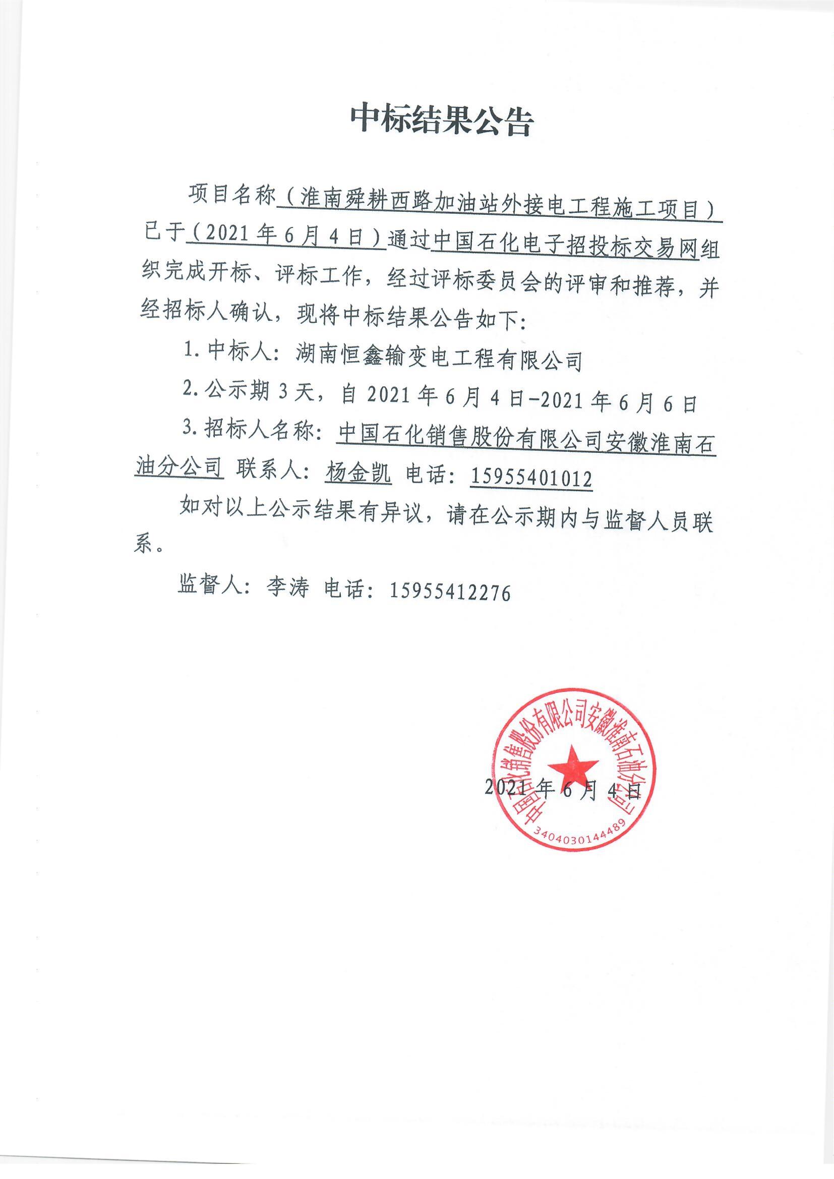 (2)项目名称: 中国石化销售股份有限公司安徽淮南石油分公司淮南舜耕西路加油站外接电工程工程施工_