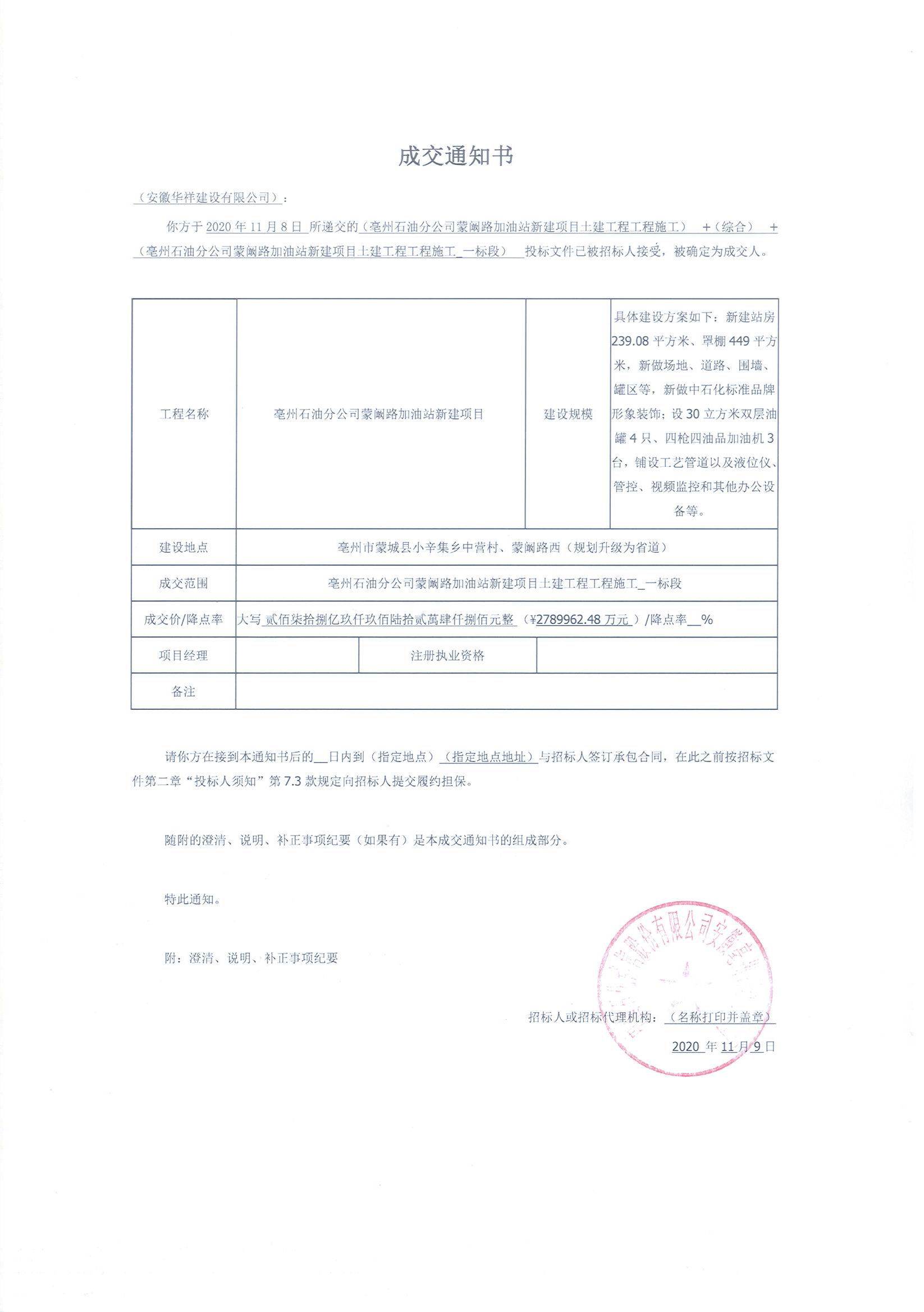 招标人已接受安徽华祥建设有限公司所递交的亳州石油分公司蒙阚路加油站新建项目土建工程工程施工_一标段投标文件,确定安徽华祥建设有限公司为中标人。