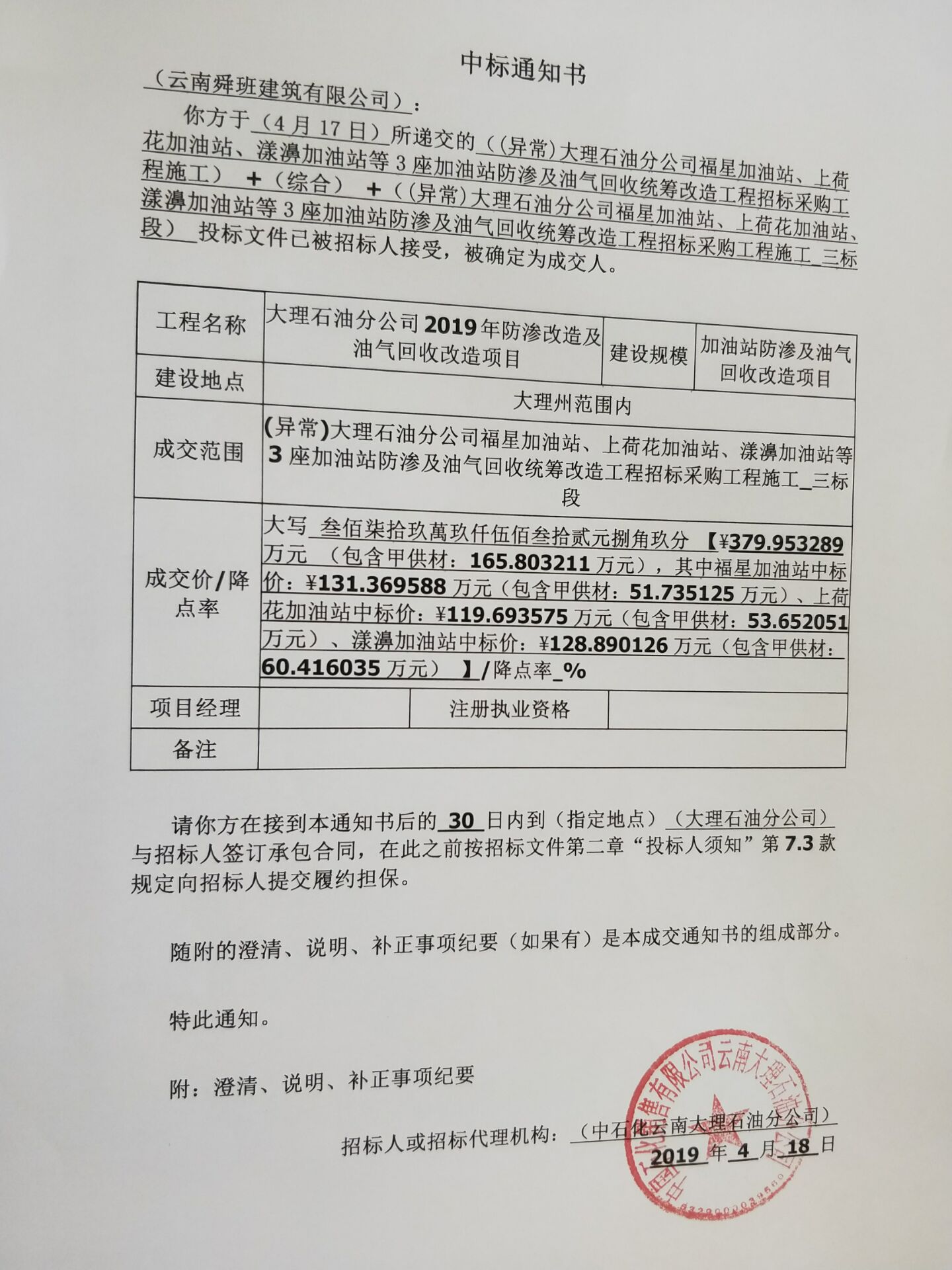 招标人已接受云南舜班建筑有限公司所递交的(异常)大理石油分公司福星加油站、上荷花加油站、漾濞加油站等3座加油站防渗及油气回收统筹改造工程招标采购工程施工_三标段投标文件,确定云南舜班建筑有限公司为中标人。