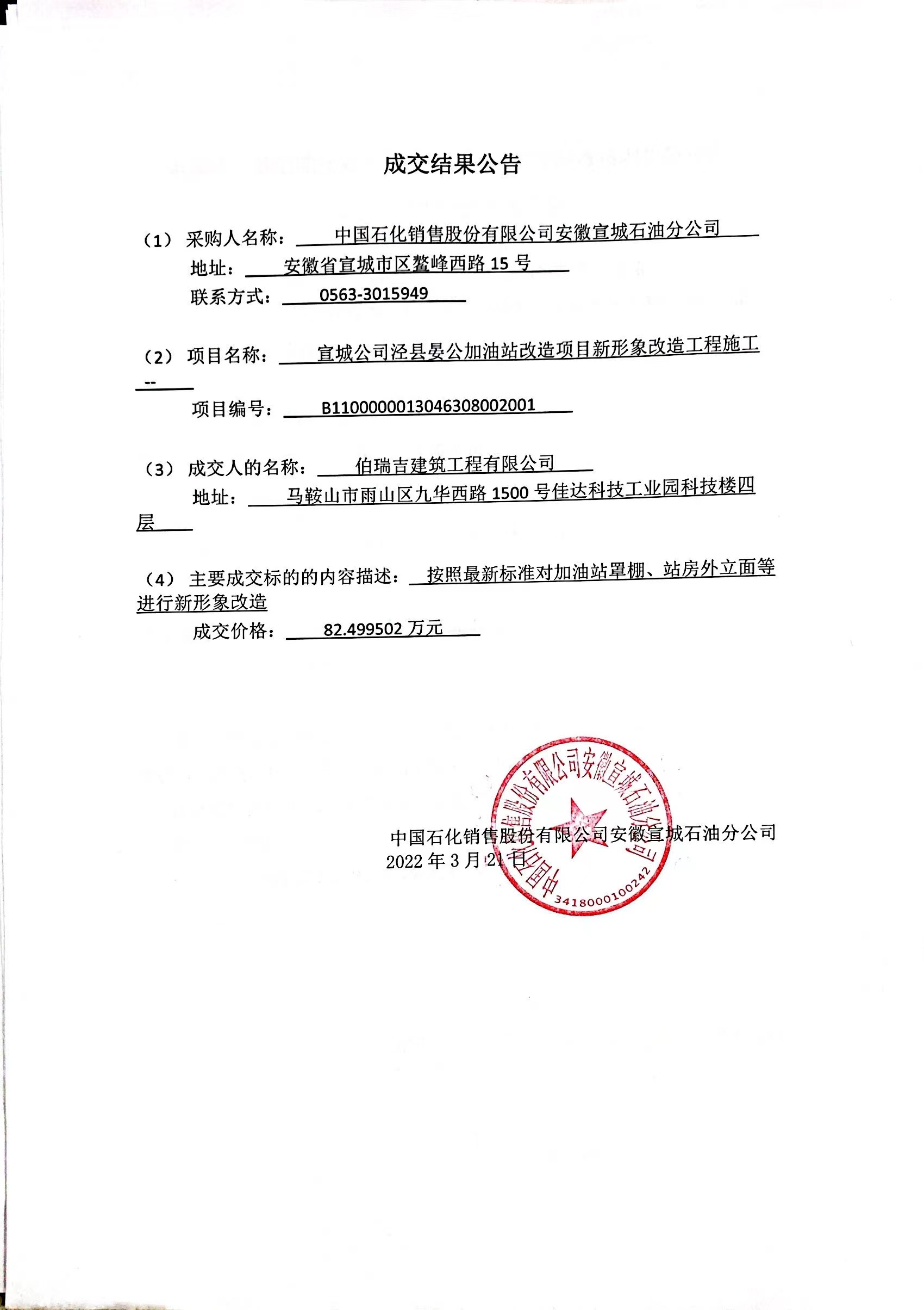 (2)项目名称: 宣城公司泾县晏公加油站改造项目新形象改造工程施工_--