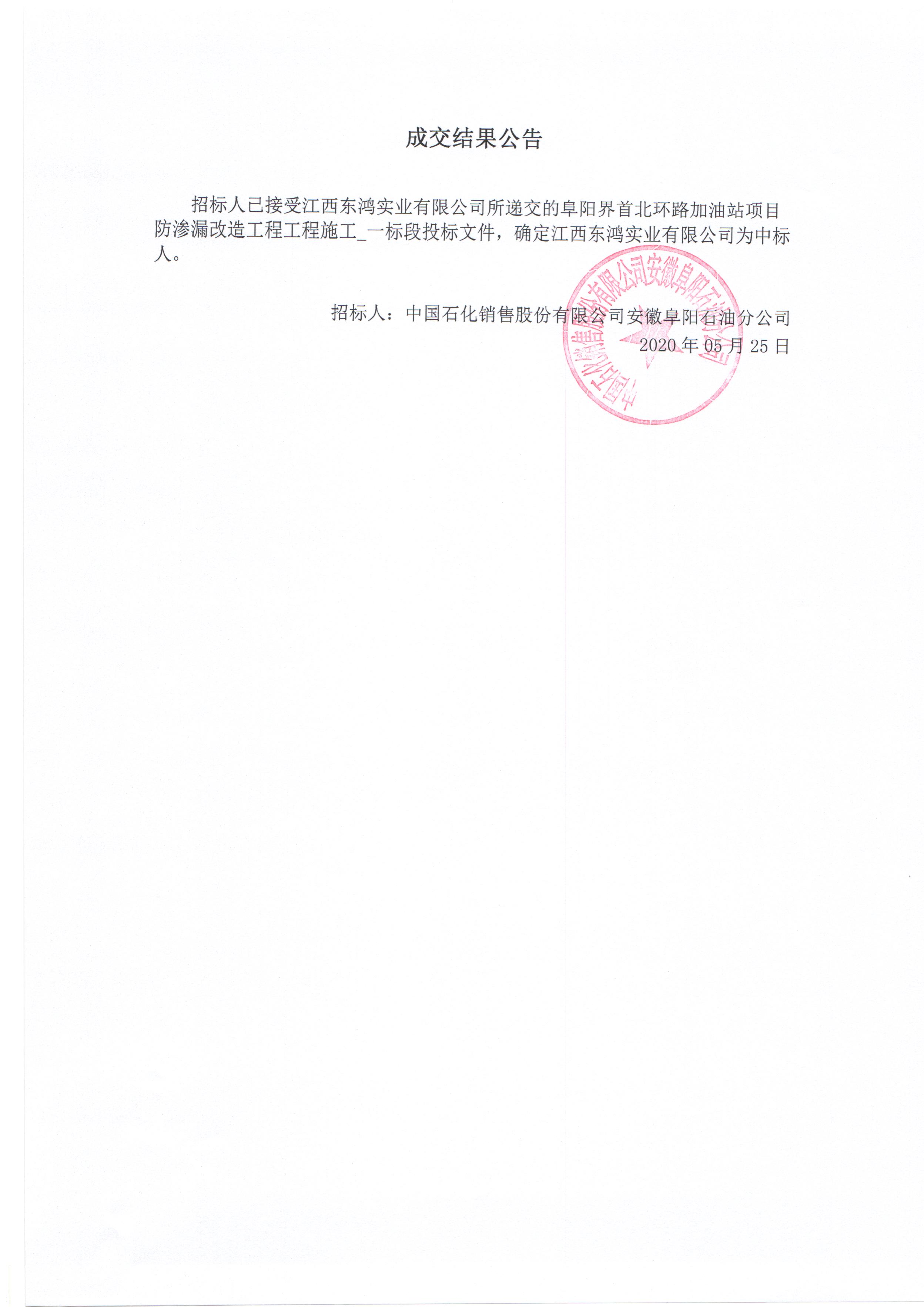 招标人已接受江西东鸿实业有限公司所递交的阜阳界首北环路加油站项目防渗漏改造工程工程施工_一标段投标文件,确定江西东鸿实业有限公司为中标人。