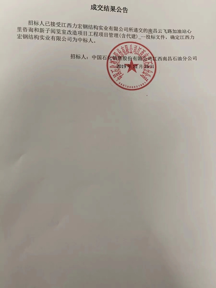 招标人已接受江西力宏钢结构实业有限公司所递交的南昌云飞路加油站心里咨询和新子阅览室改造项目工程项目管理(含代建)_--投标文件,确定江西力宏钢结构实业有限公司为中标人。