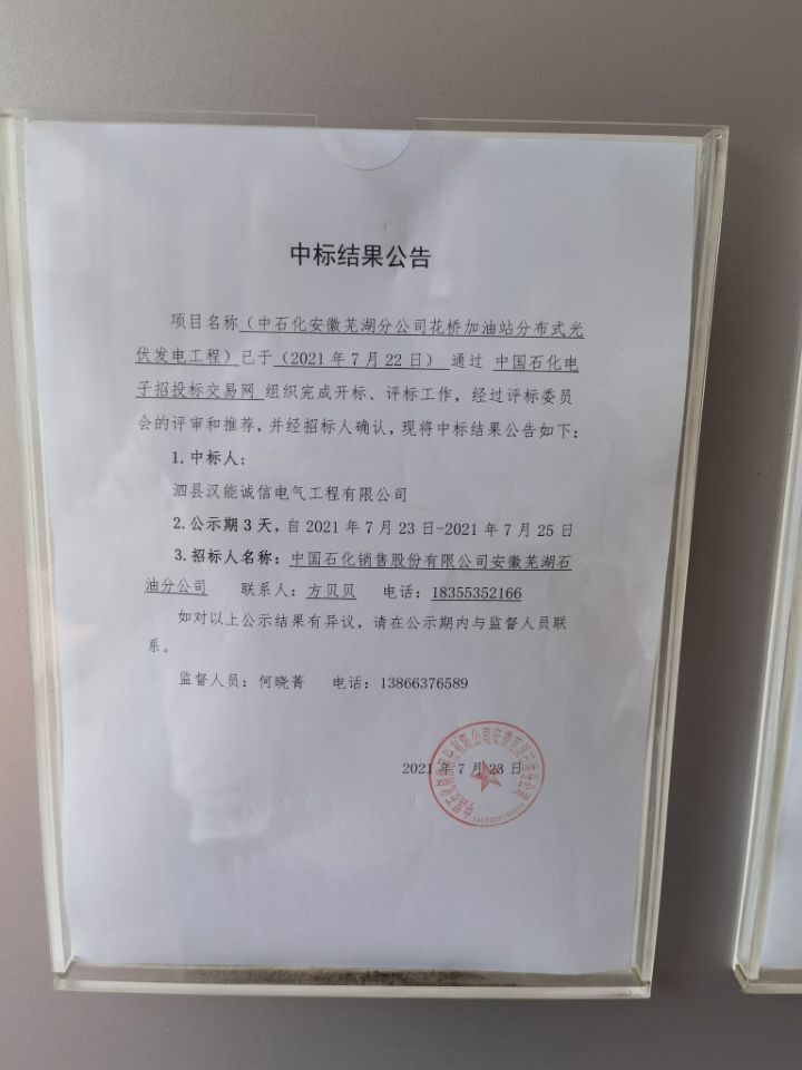 (2)项目名称: 中国石化销售股份有限公司安徽芜湖石油分公司花桥加油站分布式光伏发电工程施工_--