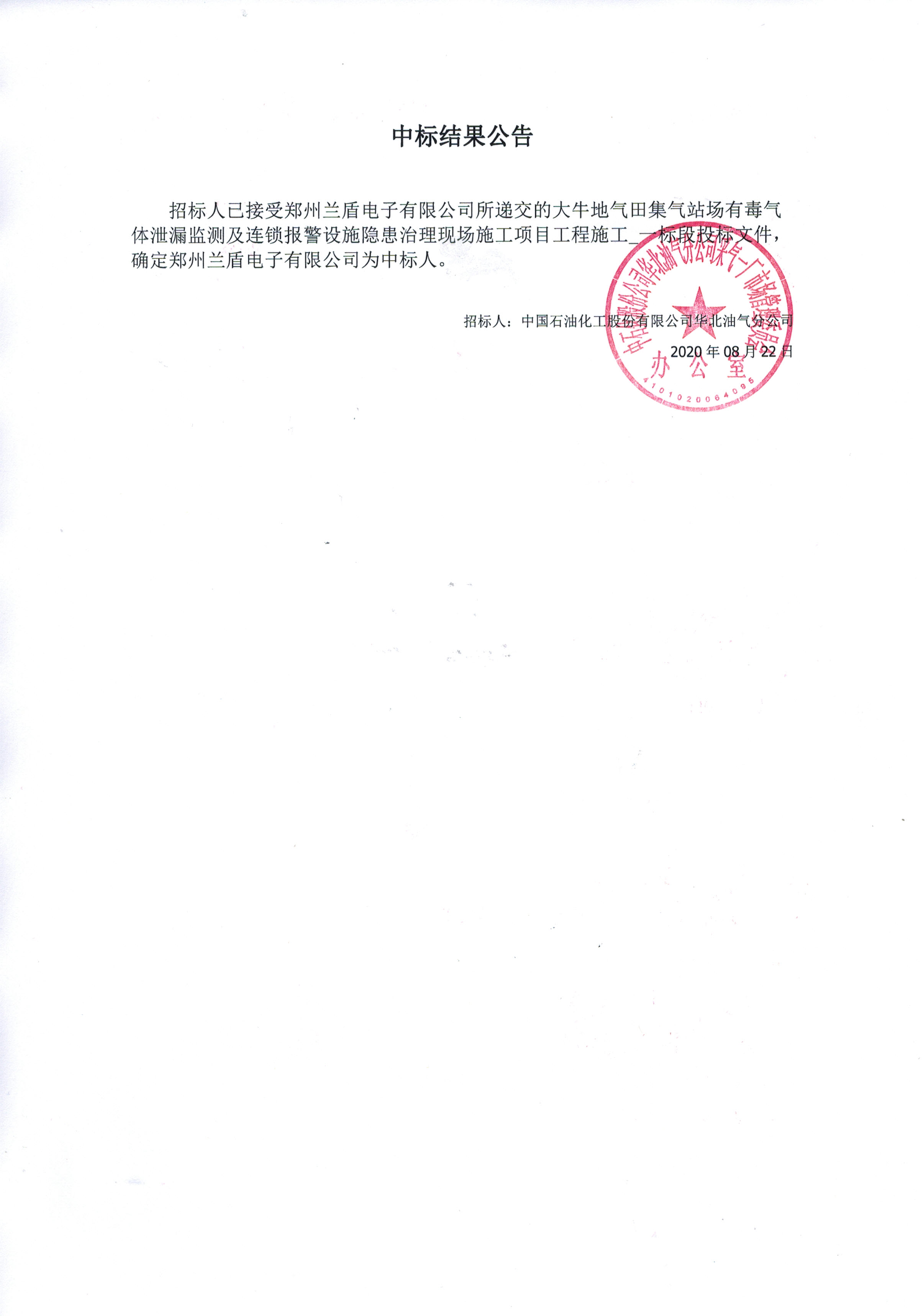 招标人已接受郑州兰盾电子有限公司所递交的大牛地气田集气站场有毒气体泄漏监测及连锁报警设施隐患治理现场施工项目工程施工_一标段投标文件,确定郑州兰盾电子有限公司为中标人。
