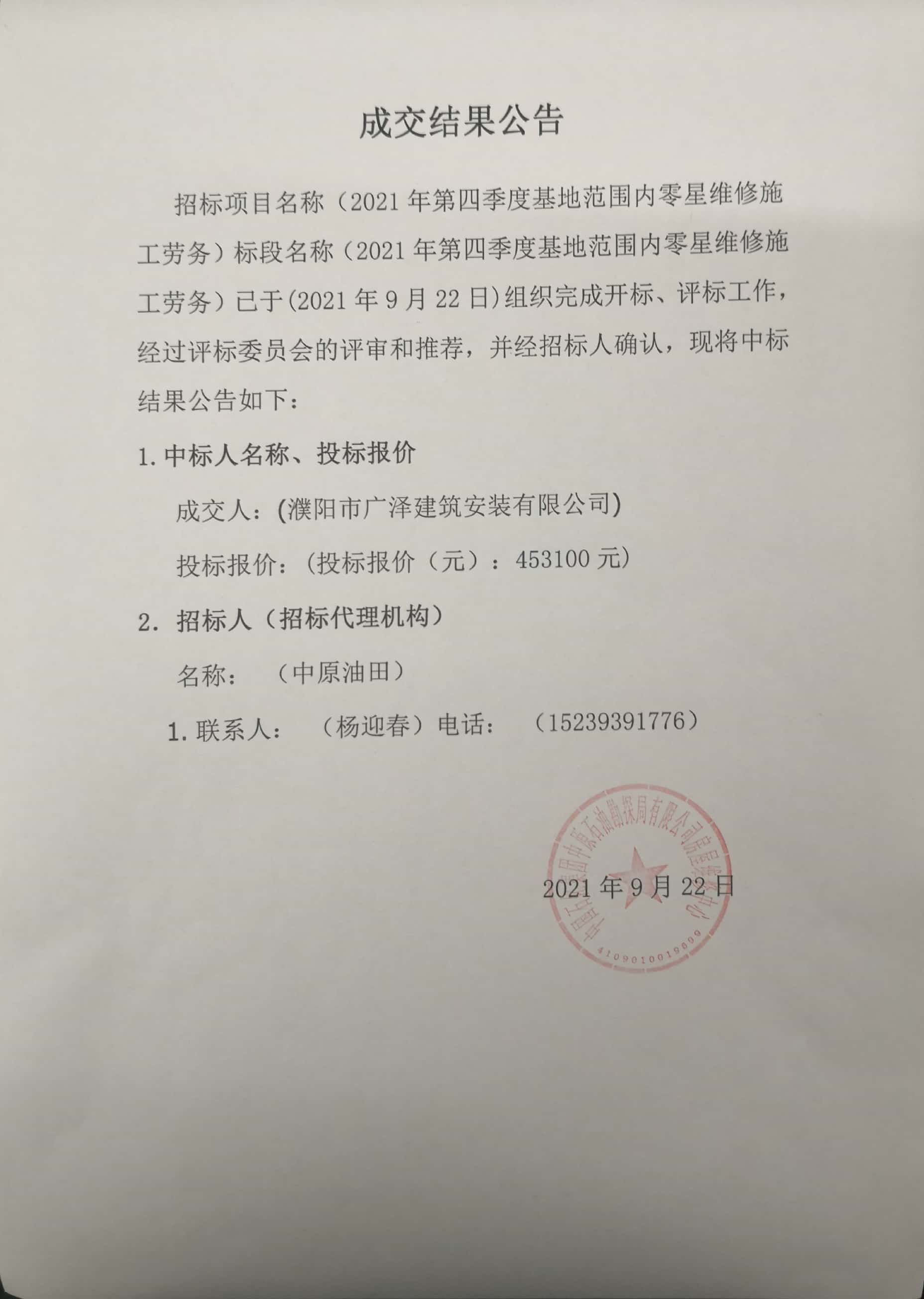招标项目名称(2021年第四季度基地范围内零星维修施工劳务)标段名称(2021年第四季度基地范围内零星维修施工劳务)已于(2021年9月22日)组织完成开标、评标工作,经过评标委员会的评审和推荐,并经招标人确认,现将中标结果公告如下: