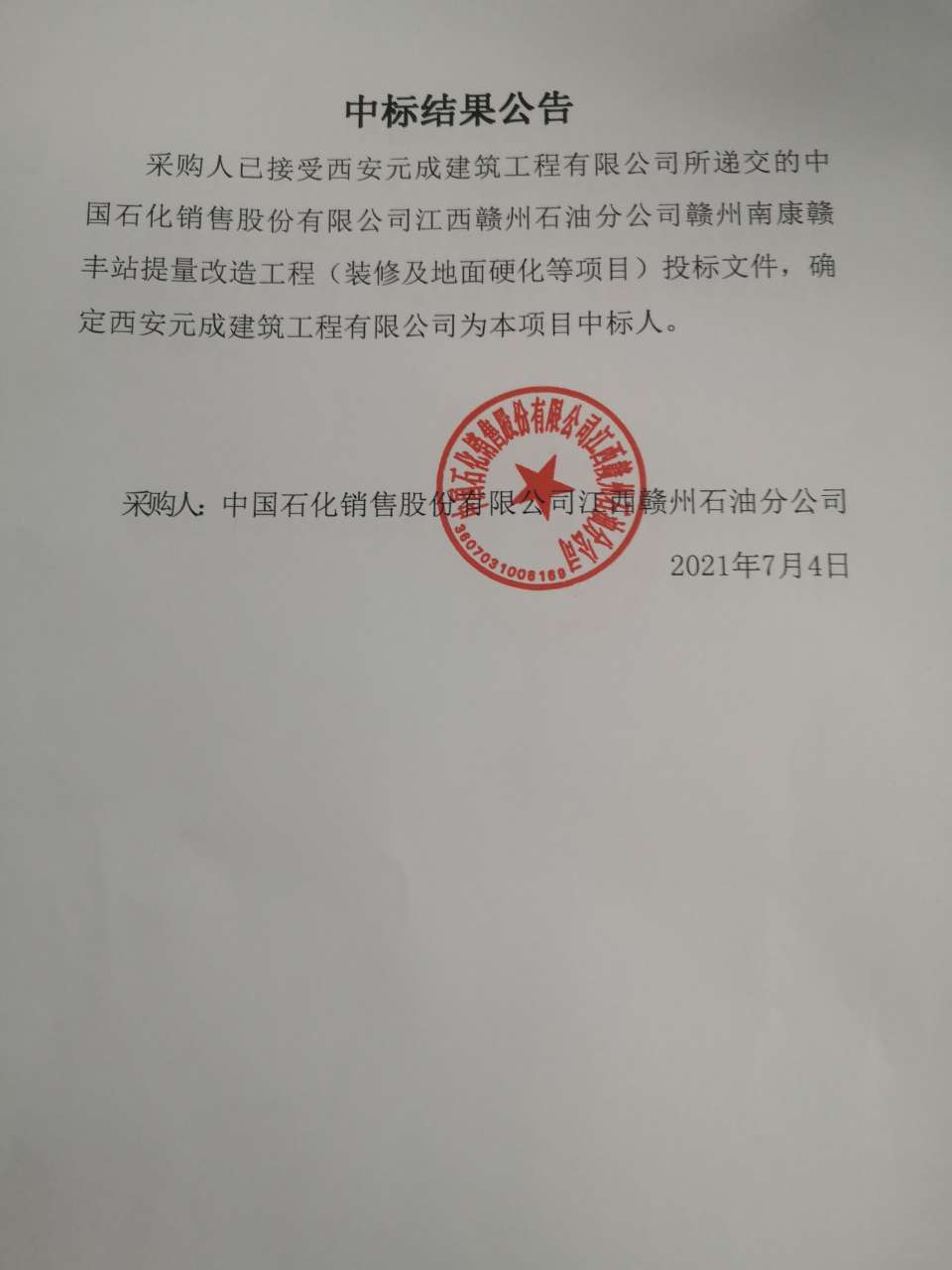 (2)项目名称: 中国石化销售股份有限公司江西赣州石油分公司赣州南康赣丰站提量改造工程(装修及地面硬化等项目)工程施工_--