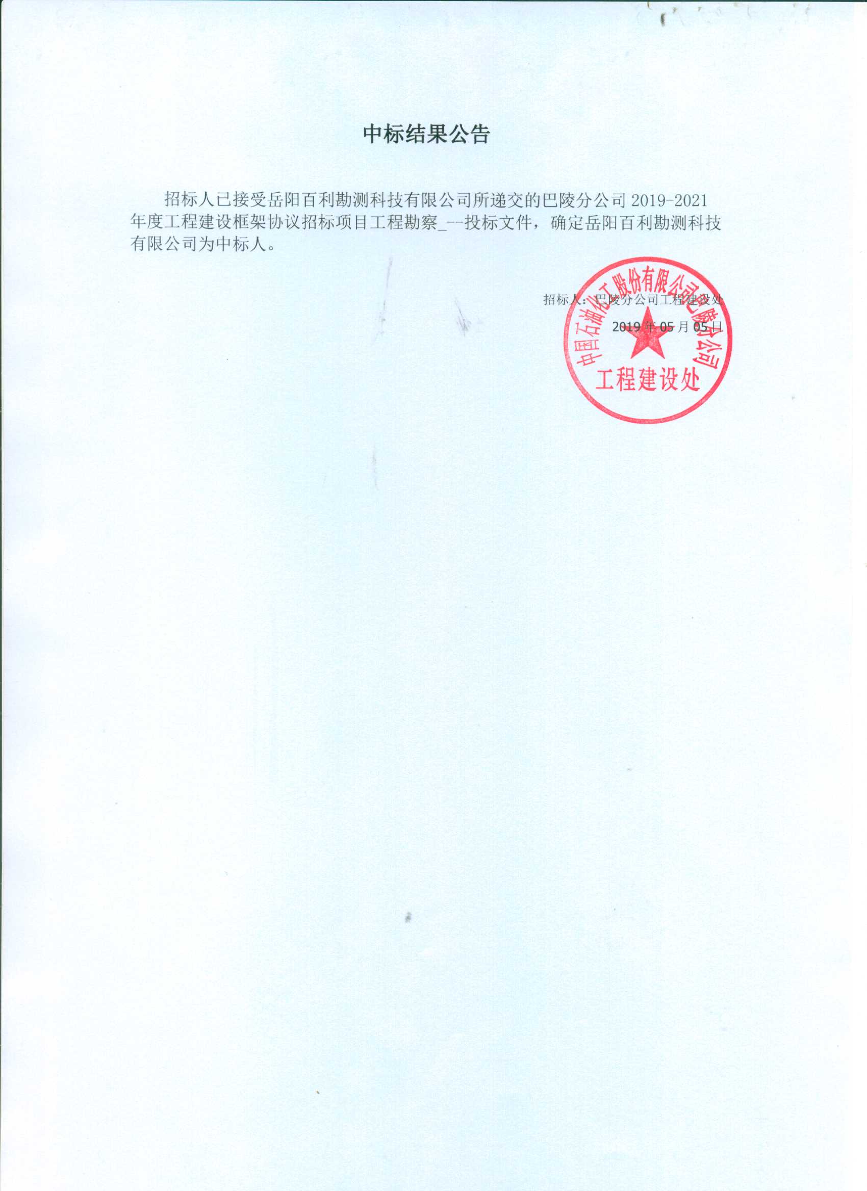 招标人已接受岳阳百利勘测科技有限公司所递交的巴陵分公司2019-2021年度工程建设框架协议招标项目工程勘察_--投标文件,确定岳阳百利勘测科技有限公司为中标人。