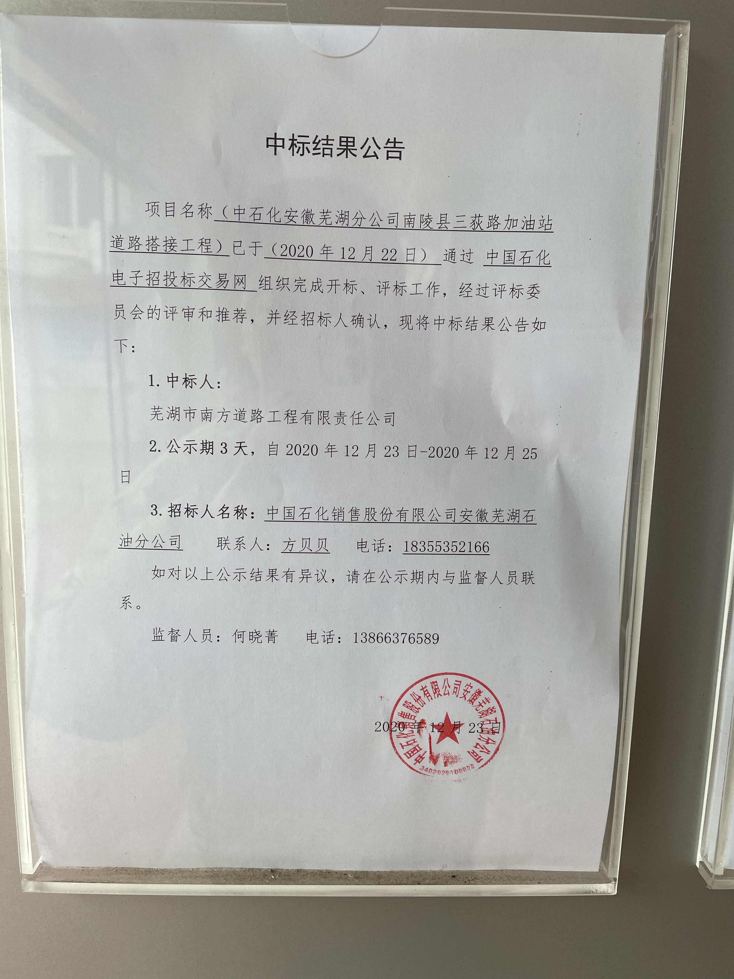 (2)项目名称: 中国石化销售股份有限公司安徽芜湖石油分公司南陵县三荻路加油站道路搭接工程工程施工