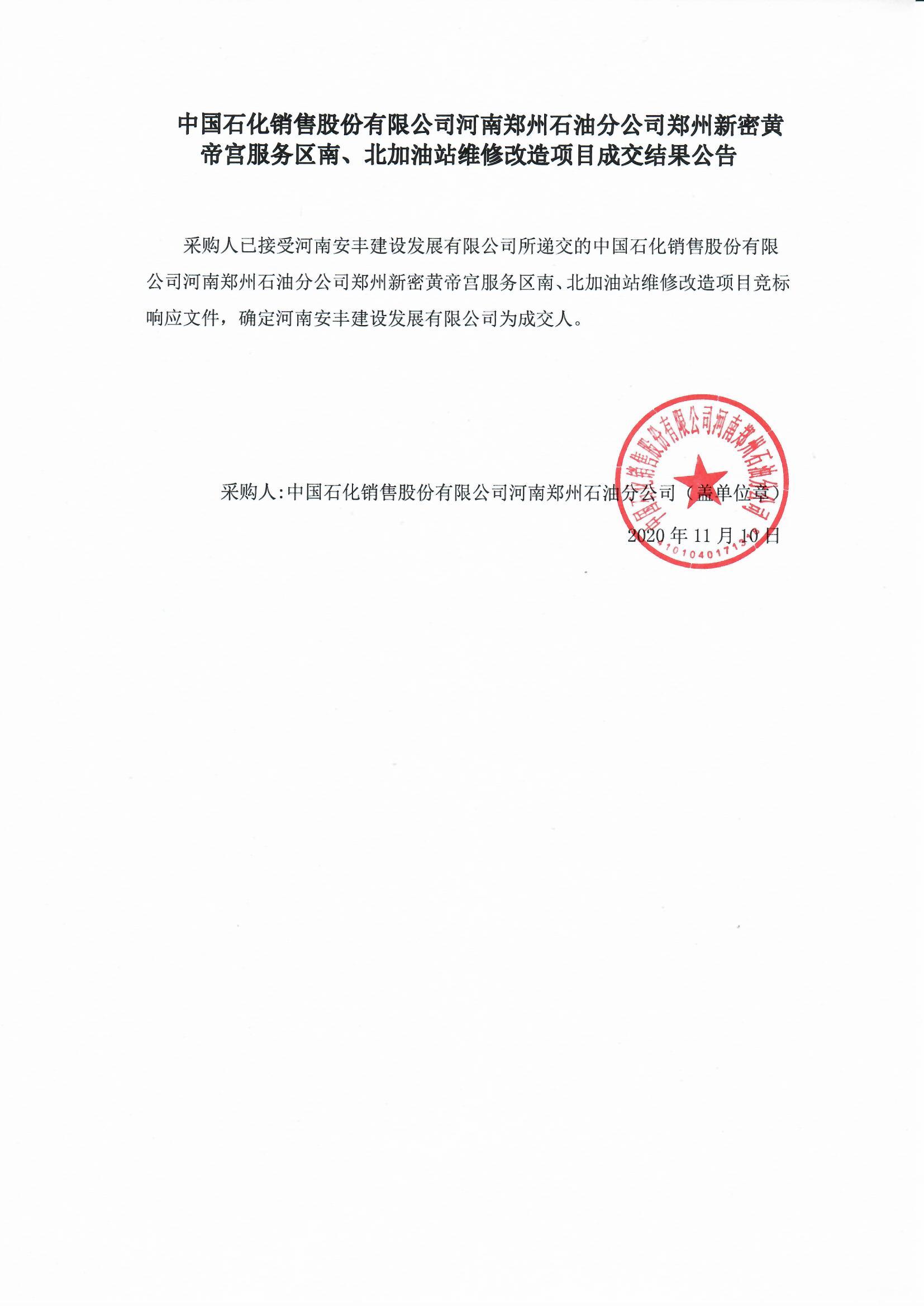 招标人已接受河南安丰建设发展有限公司所递交的中国石化销售股份有限公司河南郑州石油分公司新密黄帝宫南、北加油站维修项目改造工程工程施工_--投标文件,确定河南安丰建设发展有限公司为中标人。