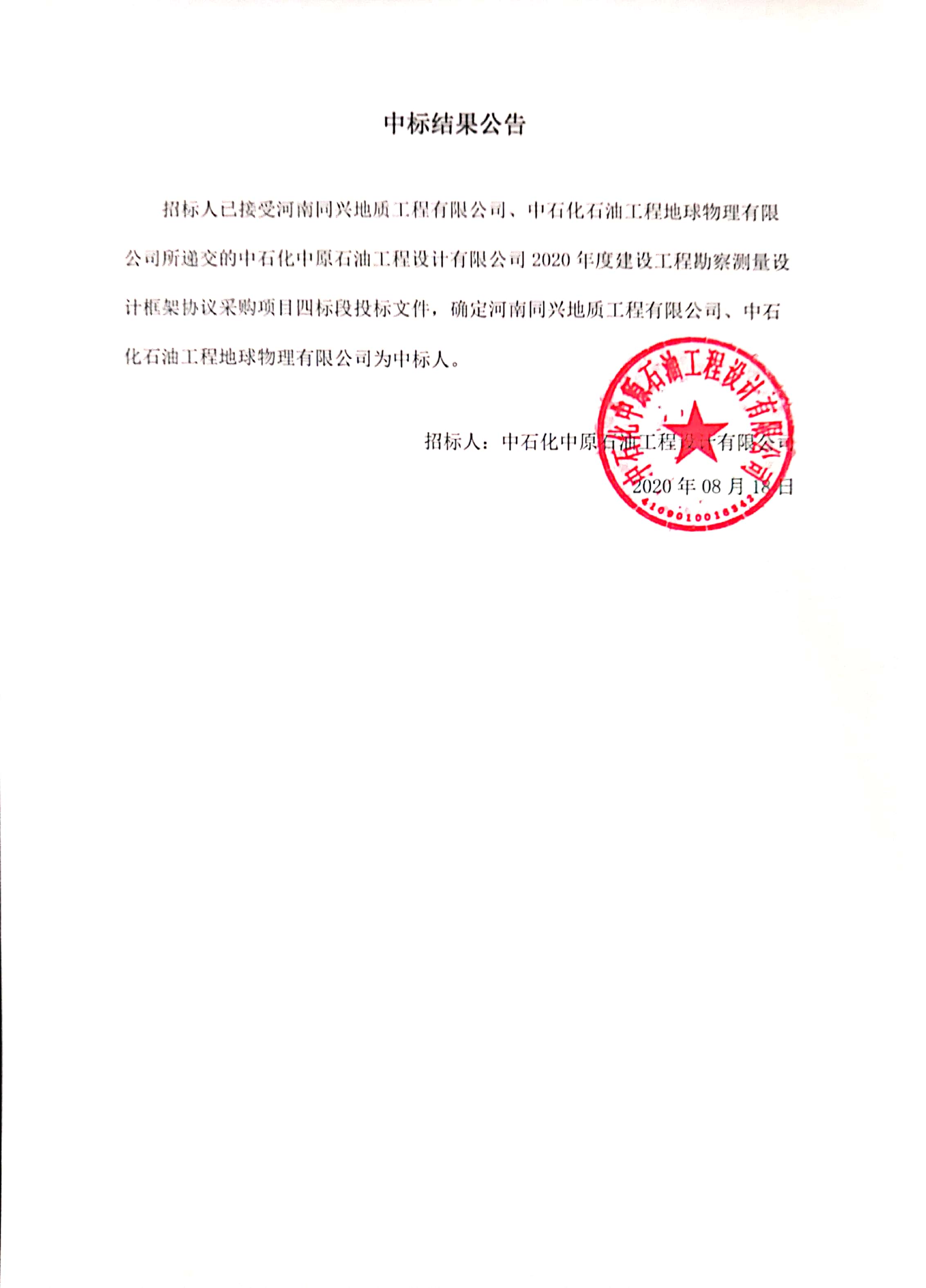 招标人已接受河南同兴地质工程有限公司、中石化石油工程地球物理有限公司所递交的中石化中原石油工程设计有限公司2020年度建设工程勘察、测量、设计框架协议采购项目工程勘察工程设计_四标段投标文件,确定河南同兴地质工程有限公司、中石化石油工程地球物理有限公司为中标人。